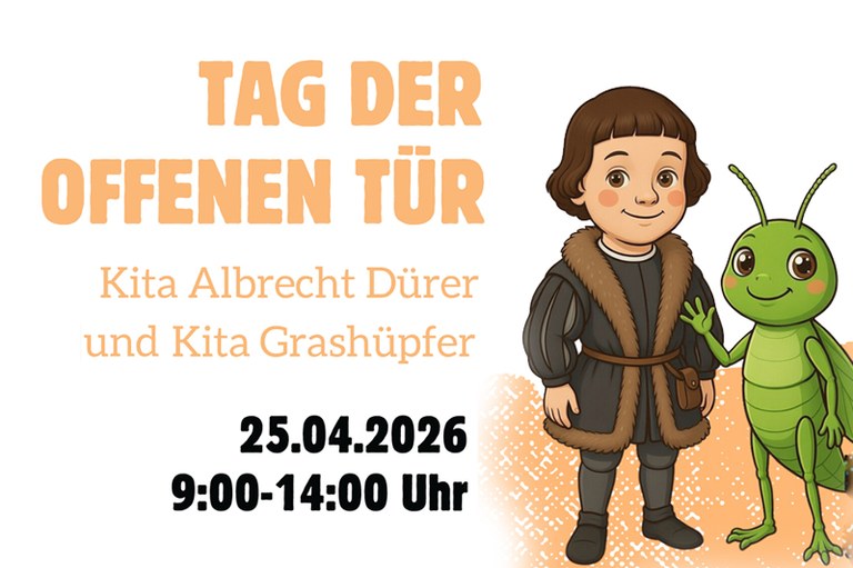 Am 25.04.2026 laden die Kitas Grashüpfer und Albrecht Dürer alle Interessierten zum Tag der offenen Tür ein. Von 9:00 - 14.00 Uhr wartet ein buntes Programm auf alle Besucher.