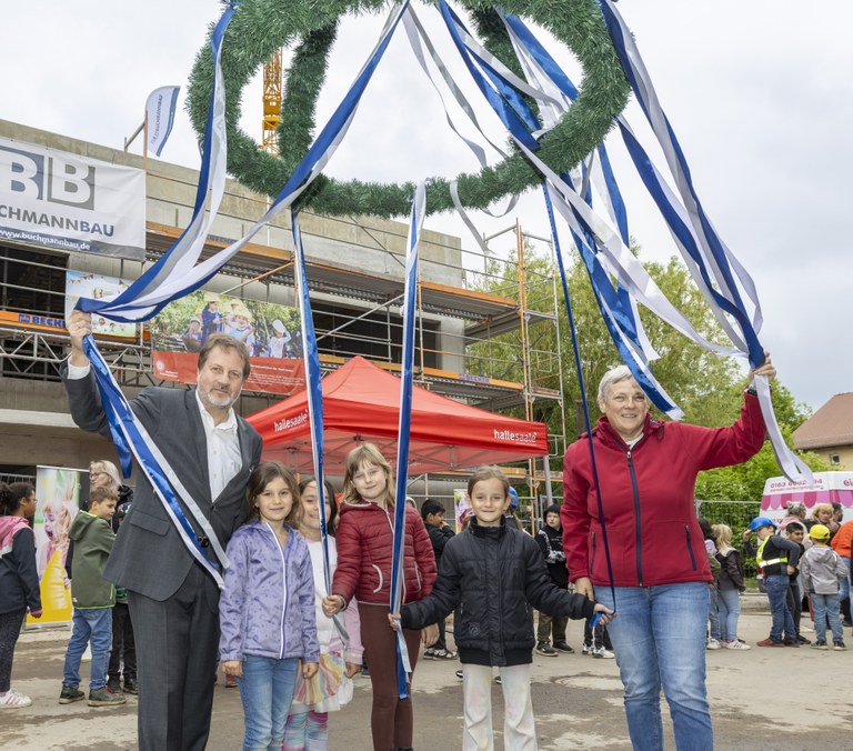 Am letzten Dienstag konnte der Abschluss des ersten Bauabschnittes mit dem lang ersehnten Richtfest gefeiert werden. Nicht nur die Kinder und Mitarbeitenden aus Kita und Hort warteten bereits voller Vorfreude auf diesen Tag. Mit dem Lied „Wer will fleißige Handwerker sehen“ empfingen die Kinder der Kita "Ökolino" die zahlreich erschienenen Gäste.